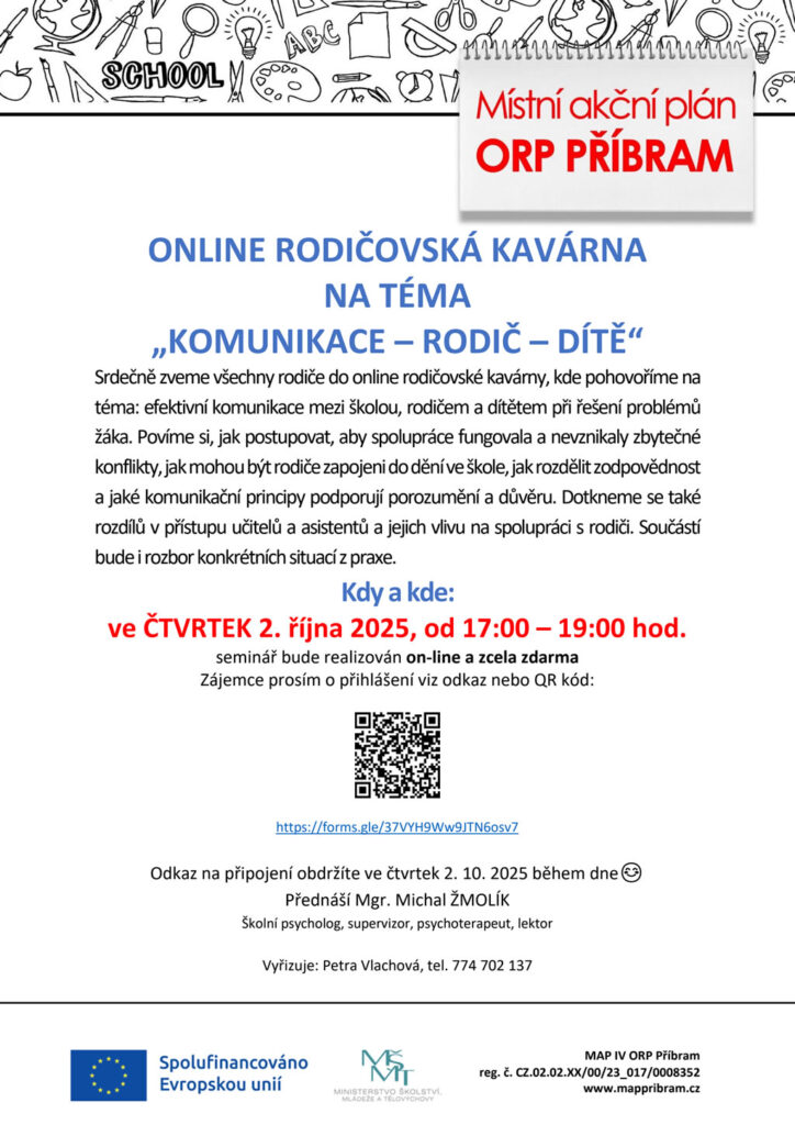 Srdečně zveme všechny rodiče do online rodičovské kavárny, kde pohovoříme na téma: efektivní komunikace mezi školou, rodičem a dítětem při řešení problémů žáka.